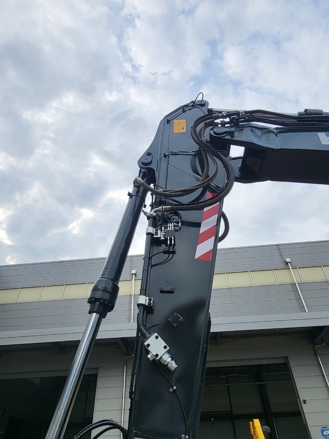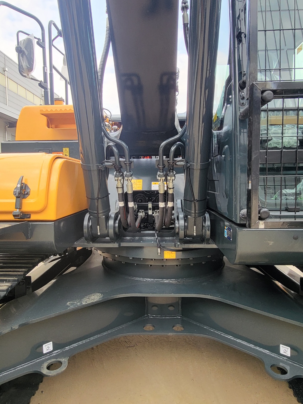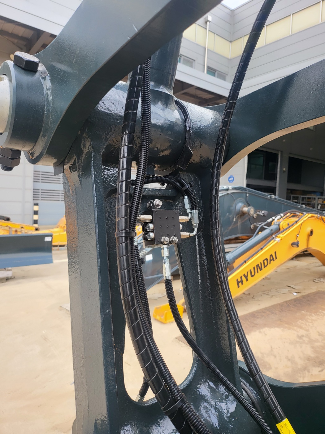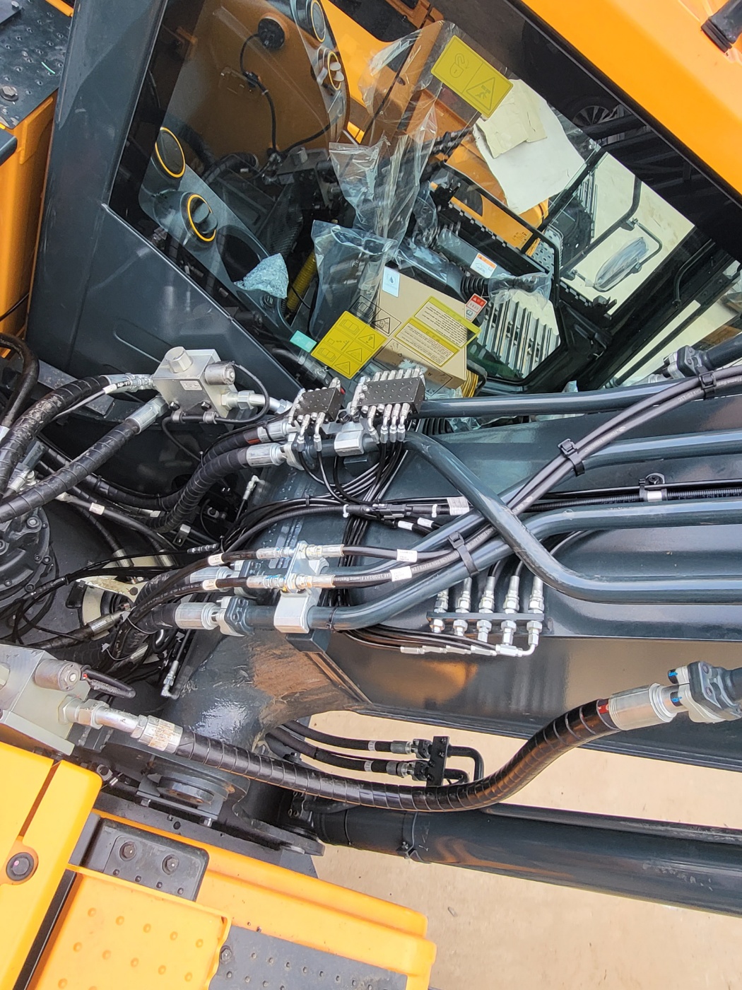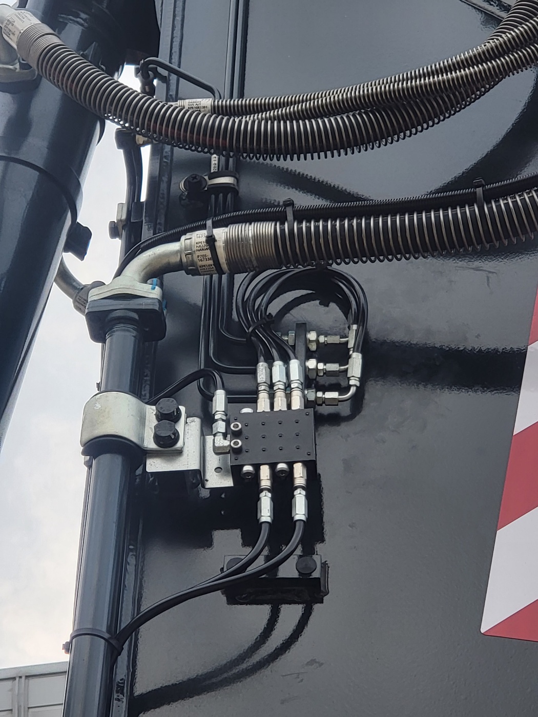 The automatic lubrication system was installed with a main distributor mounted on the spring side and secondary distributors positioned on the boom and other working sections. Grease from the pump is delivered to the main distributor and then sequentially injected to each lubrication point through dedicated distributors.